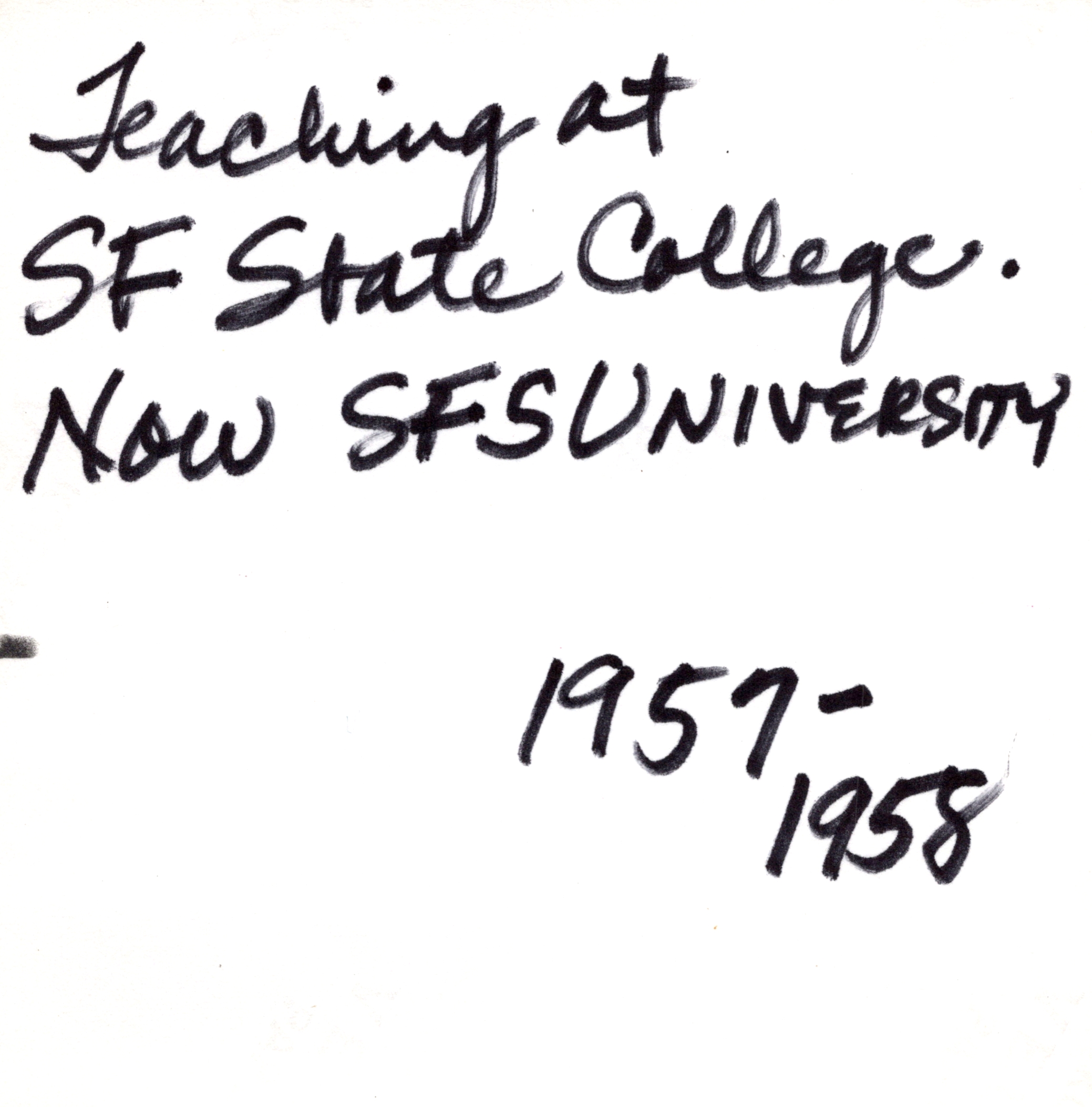 Taken during Marie Fielder's time teaching at San Francisco State College (now SFSU) between 1957-58.